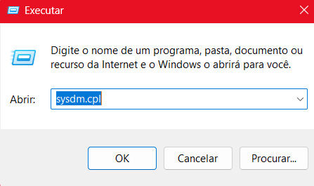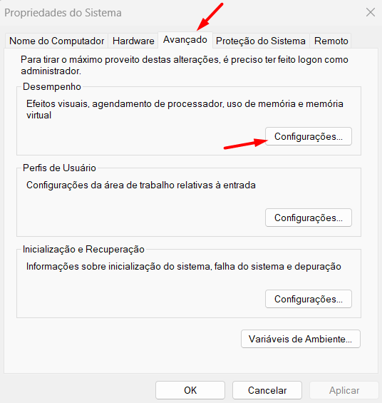 Win + R, digitesysdm.cple dê Enter. - Vá na aba Avançado > seção Desempenho > botão Configurações.